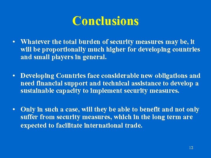 Concerns for developing countries (3) CAPACITY TO OPERATE SECURITY SYSTEMS: • Ability to understand the new security environment • • • as a whole? Necessary expertise ? Managerial capacity to implement the required measures and keep updated with the future requirements of this area still in evolution ? High level of technology required: available? 11