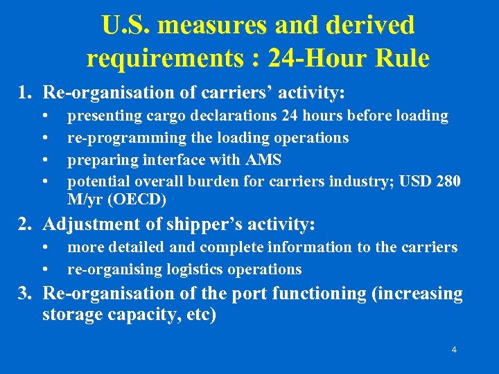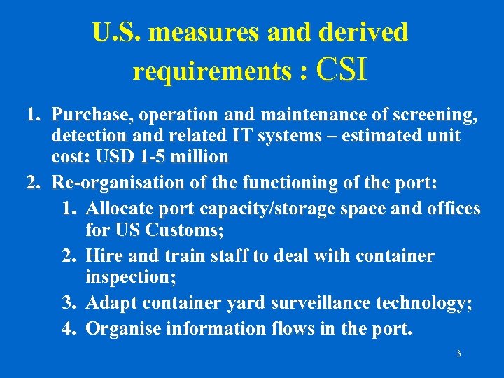 U. S. measures and derived requirements : CSI 1. Purchase, operation and maintenance of screening, detection and related IT systems – estimated unit cost: USD 1 -5 million 2. Re-organisation of the functioning of the port: 1. Allocate port capacity/storage space and offices for US Customs; 2. Hire and train staff to deal with container inspection; 3. Adapt container yard surveillance technology; 4. Organise information flows in the port. 3