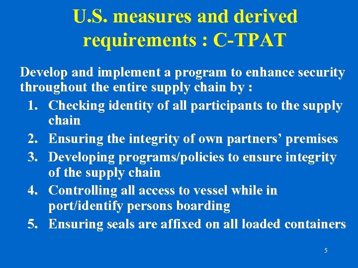 U. S. measures and derived requirements : C-TPAT Develop and implement a program to enhance security throughout the entire supply chain by : 1. Checking identity of all participants to the supply chain 2. Ensuring the integrity of own partners’ premises 3. Developing programs/policies to ensure integrity of the supply chain 4. Controlling all access to vessel while in port/identify persons boarding 5. Ensuring seals are affixed on all loaded containers 5