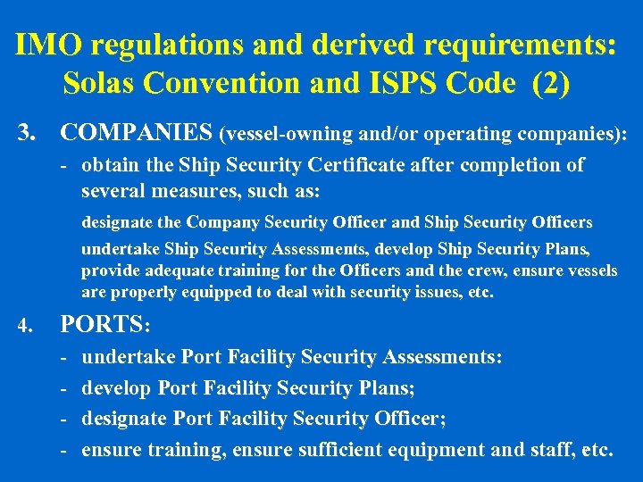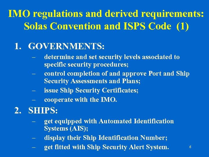 IMO regulations and derived requirements: Solas Convention and ISPS Code (1) 1. GOVERNMENTS: – – determine and set security levels associated to specific security procedures; control completion of and approve Port and Ship Security Assessments and Plans; issue Ship Security Certificates; cooperate with the IMO. 2. SHIPS: – – – get equipped with Automated Identification Systems (AIS); display their Ship Identification Number; get fitted with Ship Security Alert System. 6