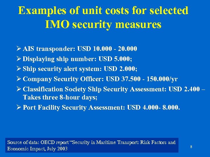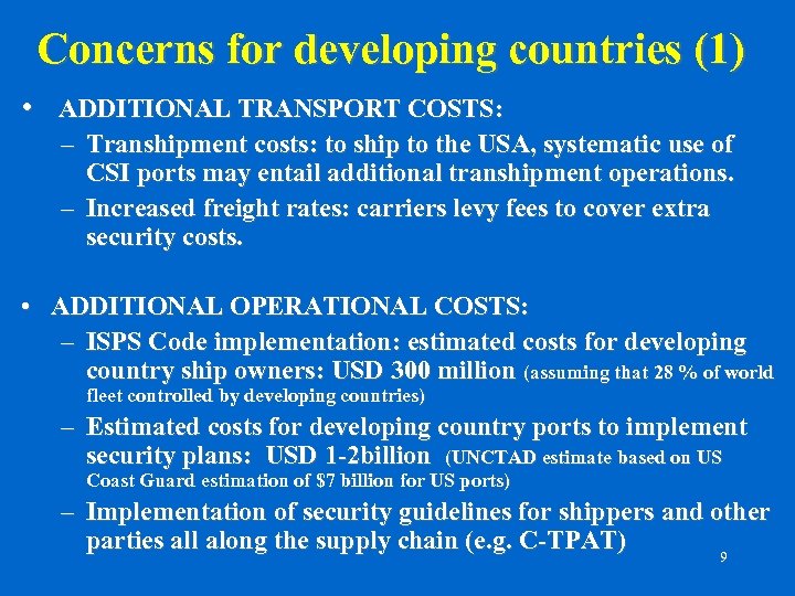 Examples of unit costs for selected IMO security measures Ø AIS transponder: USD 10. 000 - 20. 000 Ø Displaying ship number: USD 5. 000; Ø Ship security alert system: USD 2. 000; Ø Company Security Officer: USD 37. 500 - 150. 000/yr Ø Classification Society Ship Security Assessment: USD 2. 400 – Takes three 8 -hour days; Ø Port Facility Security Assessment: USD 4. 000 - 8. 000. Source of data: OECD report “Security in Maritime Transport: Risk Factors and Economic Impact, July 2003 8