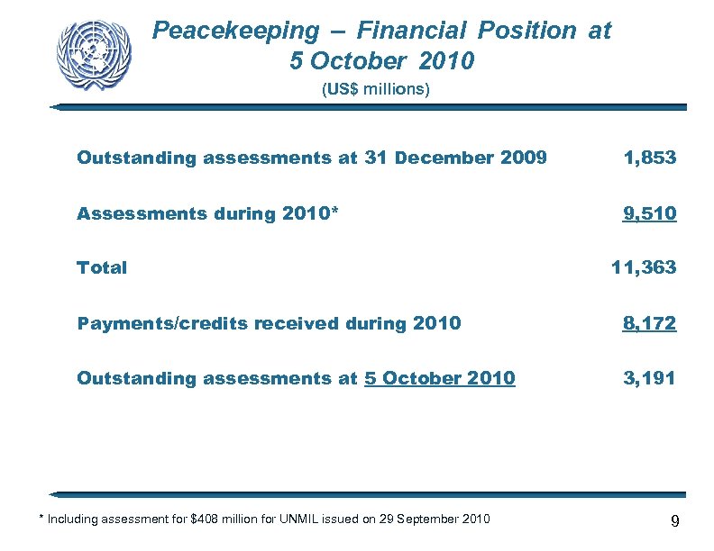 Peacekeeping – Financial Position at 5 October 2010 (US$ millions) Outstanding assessments at 31 December 2009 1, 853 Assessments during 2010* 9, 510 Total 11, 363 Payments/credits received during 2010 8, 172 Outstanding assessments at 5 October 2010 3, 191 * Including assessment for $408 million for UNMIL issued on 29 September 2010 9