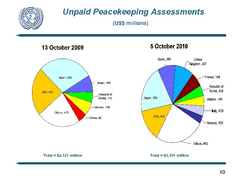Unpaid Peacekeeping Assessments (US$ millions) Total = $2, 121 million Total = $3, 191 million 10