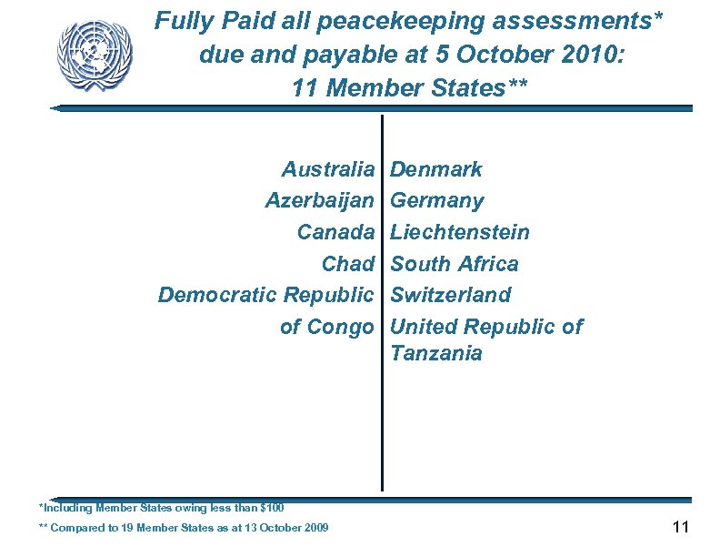 Fully Paid all peacekeeping assessments* due and payable at 5 October 2010: 11 Member States** Australia Azerbaijan Canada Chad Democratic Republic of Congo Denmark Germany Liechtenstein South Africa Switzerland United Republic of Tanzania *Including Member States owing less than $100 ** Compared to 19 Member States as at 13 October 2009 11
