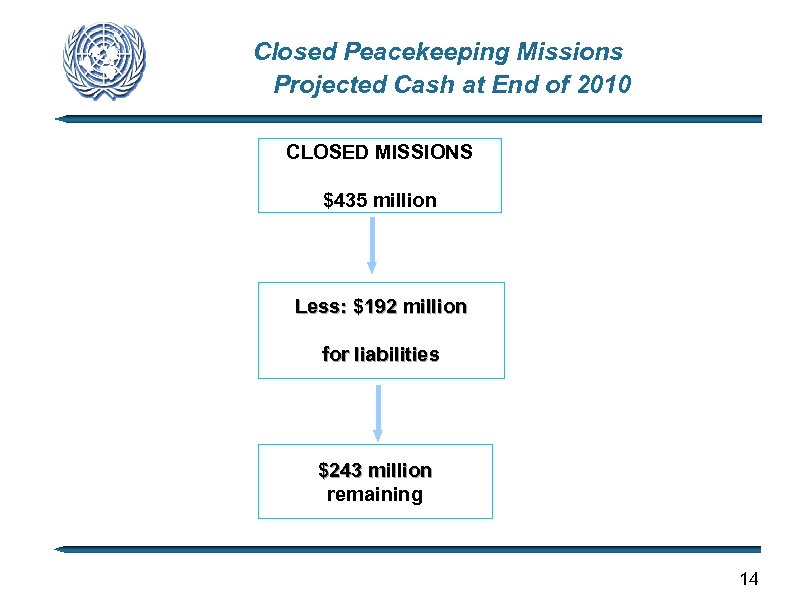 Closed Peacekeeping Missions Projected Cash at End of 2010 CLOSED MISSIONS $435 million Less: $192 million for liabilities $243 million remaining 14