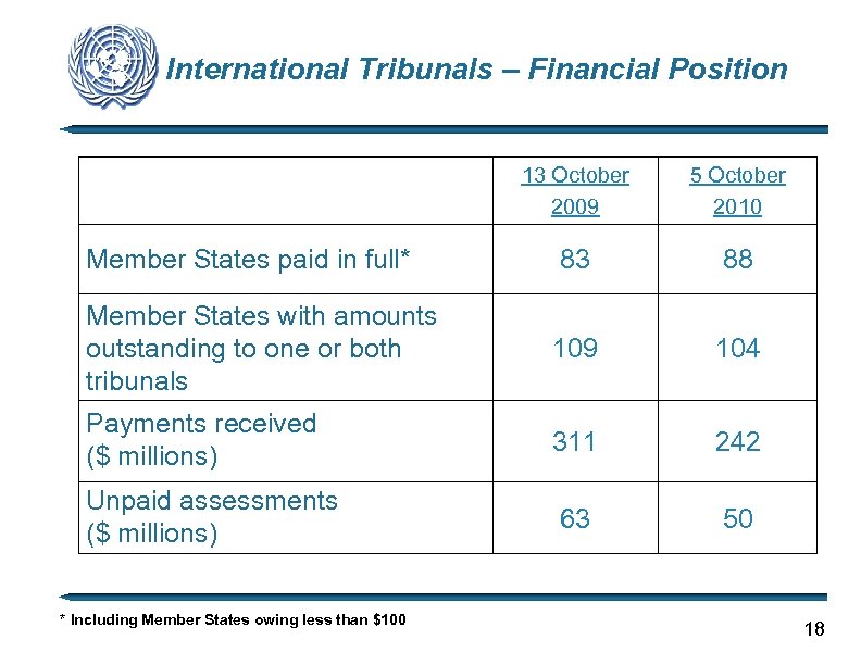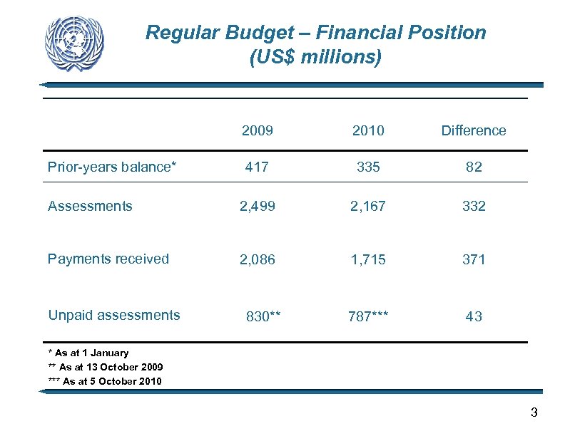 Regular Budget – Financial Position (US$ millions) 2009 2010 Difference 417 335 82 Assessments 2, 499 2, 167 332 Payments received 2, 086 1, 715 371 787*** 43 Prior-years balance* Unpaid assessments 830** * As at 1 January ** As at 13 October 2009 *** As at 5 October 2010 3