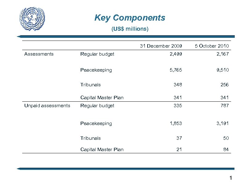 Key Components (US$ millions) 31 December 2009 5 October 2010 Regular budget 2, 499 2, 167 Peacekeeping 5, 765 9, 510 Tribunals Assessments 348 256 341 Regular budget 335 787 Peacekeeping 1, 853 3, 191 Tribunals 37 50 21 84 Capital Master Plan Unpaid assessments Capital Master Plan 1