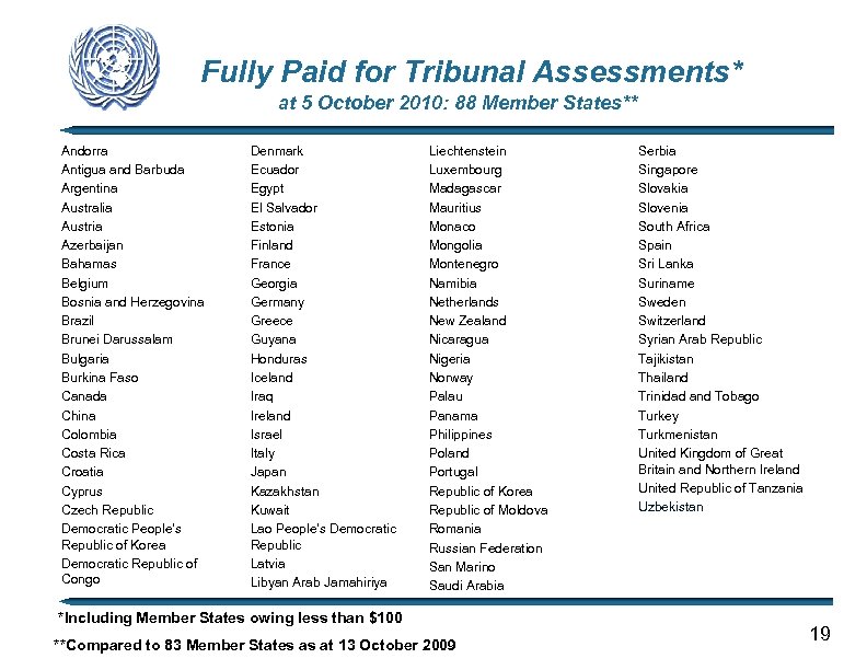 International Tribunals – Financial Position 13 October 2009 5 October 2010 Member States paid in full* 83 88 Member States with amounts outstanding to one or both tribunals 109 104 Payments received ($ millions) 311 242 Unpaid assessments ($ millions) 63 50 * Including Member States owing less than $100 18