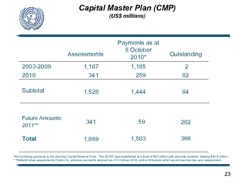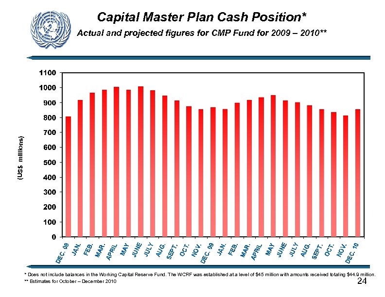 Capital Master Plan (CMP) (US$ millions) Assessments Payments as at 5 October 2010* Outstanding 2003 -2009 2010 1, 187 341 1, 185 259 2 82 Subtotal 1, 528 1, 444 84 341 59 282 Future Amounts: 2011** Total 1, 503 1, 869 366 *Not Including payments to the Working Capital Reserve Fund. The WCRF was established at a level of $45 million with amounts received totaling $44. 9 million * *Reflects future assessments (Option A), advance payments received as of 5 October 2010, and contributions which would become due upon assessment. 23