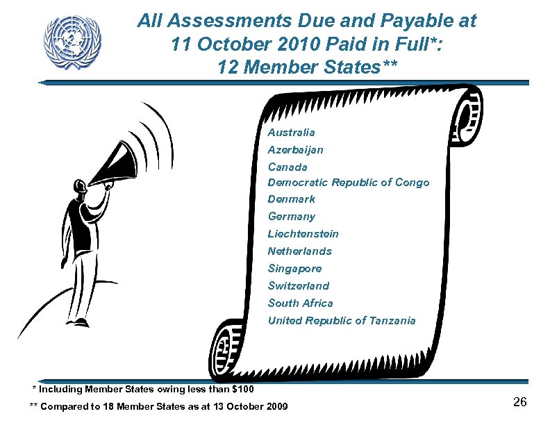 All Assessments Due and Payable at 11 October 2010 Paid in Full*: 12 Member States** Australia Azerbaijan Canada Democratic Republic of Congo Denmark Germany Liechtenstein Netherlands Singapore Switzerland South Africa United Republic of Tanzania * Including Member States owing less than $100 ** Compared to 18 Member States as at 13 October 2009 26