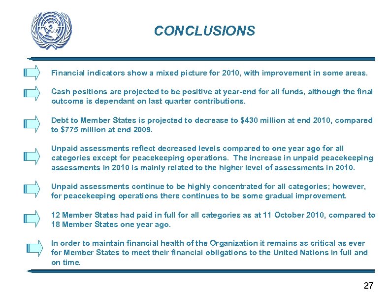 CONCLUSIONS Financial indicators show a mixed picture for 2010, with improvement in some areas. Cash positions are projected to be positive at year-end for all funds, although the final outcome is dependant on last quarter contributions. Debt to Member States is projected to decrease to $430 million at end 2010, compared to $775 million at end 2009. Unpaid assessments reflect decreased levels compared to one year ago for all categories except for peacekeeping operations. The increase in unpaid peacekeeping assessments in 2010 is mainly related to the higher level of assessments in 2010. Unpaid assessments continue to be highly concentrated for all categories; however, for peacekeeping operations there continues to be some gradual improvement. 12 Member States had paid in full for all categories as at 11 October 2010, compared to 18 Member States one year ago. In order to maintain financial health of the Organization it remains as critical as ever for Member States to meet their financial obligations to the United Nations in full and on time. 27