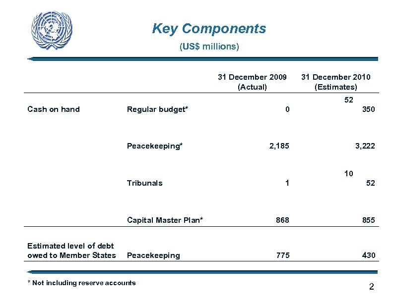 Key Components (US$ millions) 31 December 2009 (Actual) 31 December 2010 (Estimates) 52 Cash on hand Regular budget* Peacekeeping* 0 350 2, 185 3, 222 10 Tribunals 52 Capital Master Plan* Estimated level of debt owed to Member States 1 868 855 Peacekeeping 775 430 * Not including reserve accounts 2