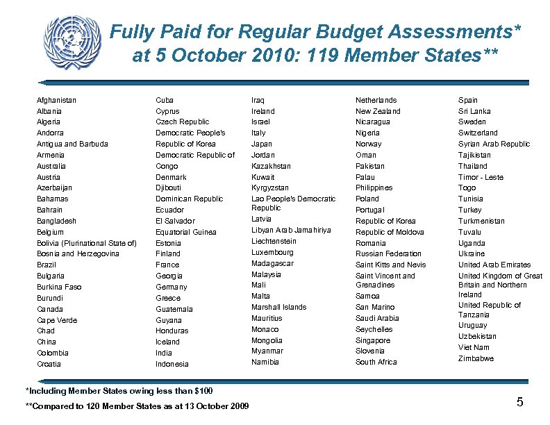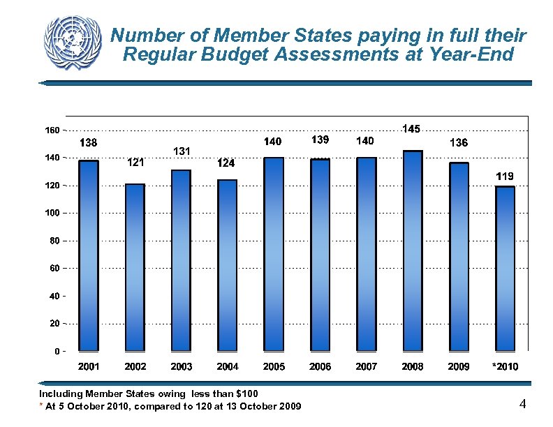 Number of Member States paying in full their Regular Budget Assessments at Year-End Including Member States owing less than $100 * At 5 October 2010, compared to 120 at 13 October 2009 4