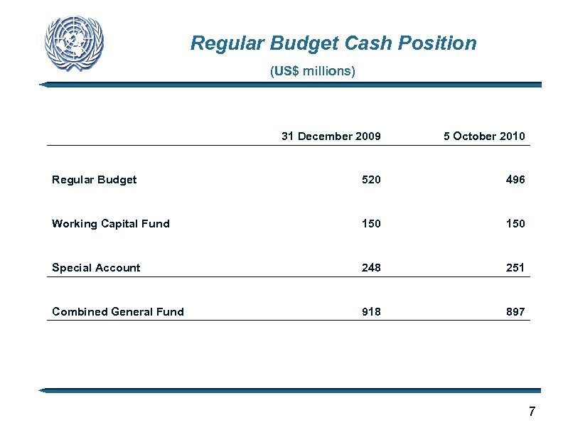 Regular Budget Cash Position (US$ millions) 31 December 2009 5 October 2010 Regular Budget 520 496 Working Capital Fund 150 Special Account 248 251 Combined General Fund 918 897 7