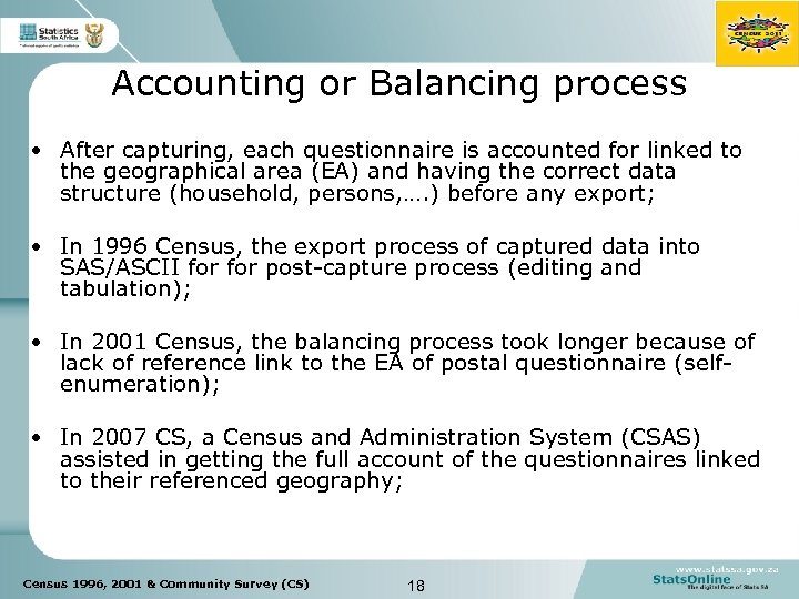 Accounting or Balancing process • After capturing, each questionnaire is accounted for linked to the geographical area (EA) and having the correct data structure (household, persons, …. ) before any export; • In 1996 Census, the export process of captured data into SAS/ASCII for post-capture process (editing and tabulation); • In 2001 Census, the balancing process took longer because of lack of reference link to the EA of postal questionnaire (selfenumeration); • In 2007 CS, a Census and Administration System (CSAS) assisted in getting the full account of the questionnaires linked to their referenced geography; Census 1996, 2001 & Community Survey (CS) 18