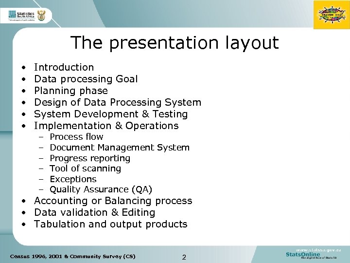 The presentation layout • • • Introduction Data processing Goal Planning phase Design of Data Processing System Development & Testing Implementation & Operations – – – Process flow Document Management System Progress reporting Tool of scanning Exceptions Quality Assurance (QA) • Accounting or Balancing process • Data validation & Editing • Tabulation and output products Census 1996, 2001 & Community Survey (CS) 2