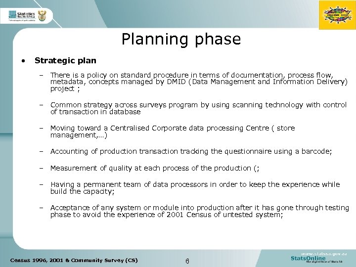 • Planning phase Going through the lessons learned from previous censuses and surveys (1996 Census, 2001 census, 2007 Community Survey) – Preparation of processing site • In 1996 Census, distributed data processing centre in 9 provinces • In 2001 Census and 2007 CS centralized data processing centre – Mode of Data Capturing • In 1996 Census Manual capturing (key from paper) running on SQL database with interface developed in visual basic • In 2001 Census and 2007 CS: Use of proprietary scanning technology linked to Oracle database – Census Budget • The 1996 Census budget estimated at 500 Million Rand • The 2001 Census budget estimated at 1. 2 Billion Rand • The 2007 CS budget estimated at 600 Million Rand – Human Resource • The 1996 Census have more staff for key from paper (options considered for Job creation across the country) • The 2001 Census and 2007 CS has a reduced number of staff supporting the scanning technology working on shifts – Duration • The 1996 Census data capturing was planned for 12 Months • The 2001 Census was planned for 6 months. However, the period was extended 18 months due to not tested new technology • The 2007 CS took only 3 months as planned – Systems design and specifications • In 2001 Census, system specification & development was reviewed during implementation • In 2007 CS, most the system specification & development were completed and tested before the production Census 1996, 2001 & Community Survey (CS) 5