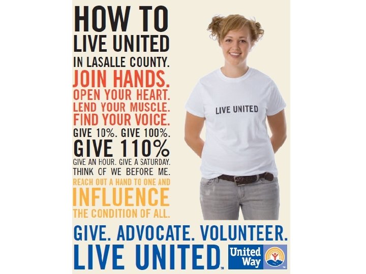 United Way of Eastern La. Salle County Community Impact 92 – Labor of Love (Home Restoration Program) 95 – Letter Carrier’s Food Drive (Promotion, volunteer recruitment) 98 – Community Food Basket (Established & managed 1 year - $20, 700 start-up) 99 – Community Food Basket became stand alone agency 99 – School Tools (School supplies for 1500 low income students - $10, 000 worth annually) 99/01 – FOCUS 2001 (Community Needs Assessment) 00 – DHS Front Door Funds (Fiscal Agent & Community Partner of $10, 000 grant) 03 – Bridges Community Center (Senior Center) $18, 400 start-up 03 – Community Care Program (Emergency/Basic Needs Assistance $35, 000 annually) 04 – Utica/Granville Tornado Relief (Raised & distributed $37, 000) 04/05 – Mayor’s Drug Task Force (Participant & Grantor $500) 05/06 – Community Health Clinic for uninsured ($40, 000 start-up) 06 – Volunteer Recognition Event 07/08 – “Bornlearning” & “Dolly Parton Imagination Library” 08/09 – Financial Stability (VITA) Volunteer Income Tax Assistance 09 – Flood Relief distribution of $80, 000 (Fiscal Agent & Community Partner) 09 – Distributing AARA Economic Stimulus Money (emergency shelter & utilities - $16, 800 Ongoing Programs: EFSP – Information & Referral – Volunteer Coordination – Gift-in-Kind - Website Results matter. . .