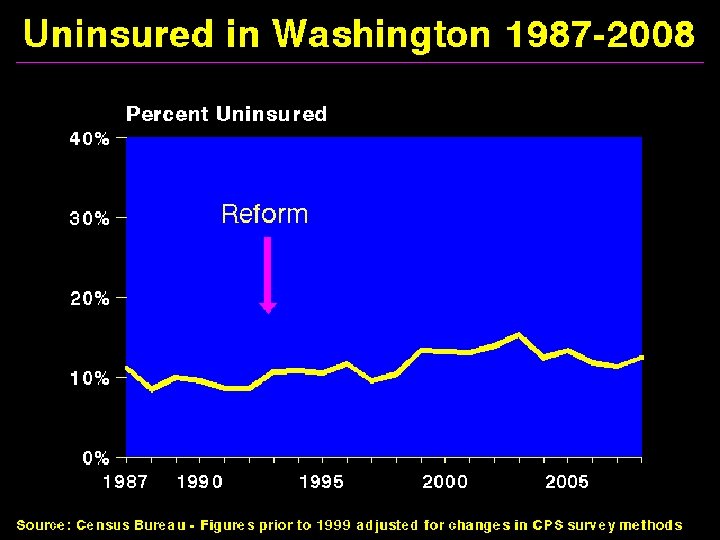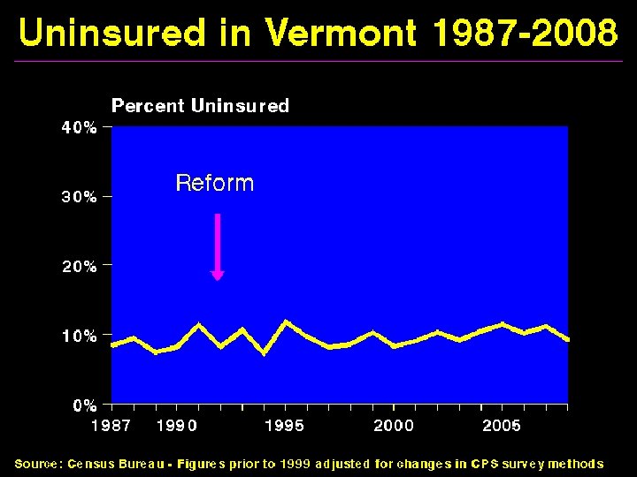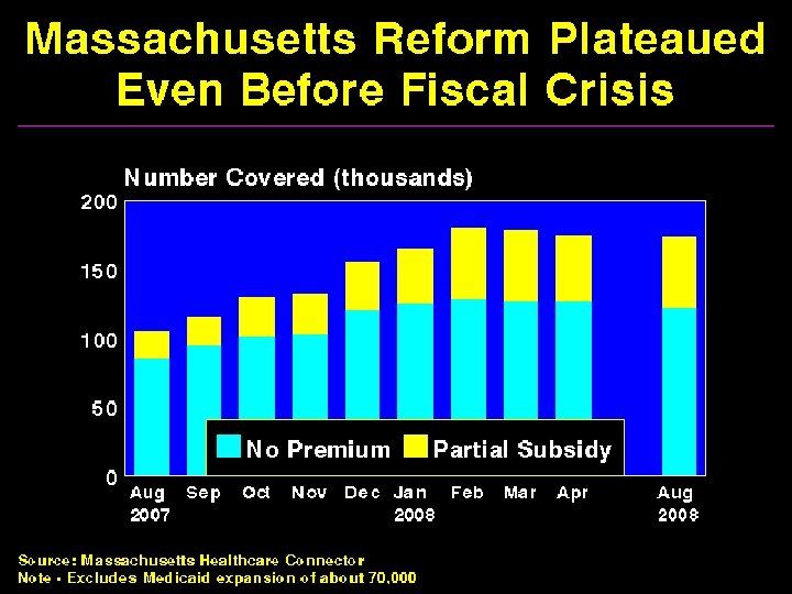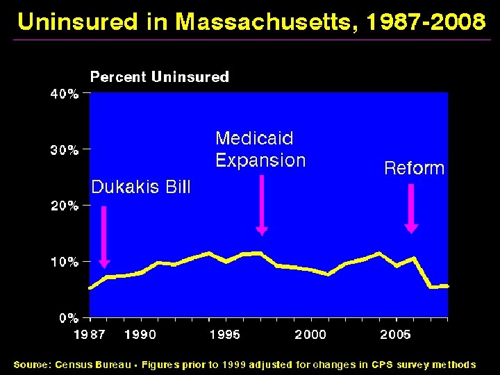 Massachusetts 2006, Medicaid and medicaid-like expansions, mandates, + public plan option for those <300% poverty “Every uninsured citizen in Massachusetts will soon have affordable health insurance and the costs of health care will be reduced. Gov. Romney. ” “The bill does what health experts say no other state has been able to do: provide a mechanism for all of its citizens to obtain health insurance. ” Sources: Wall Street Journal 4/11/06 and New York Times 4/5/06.