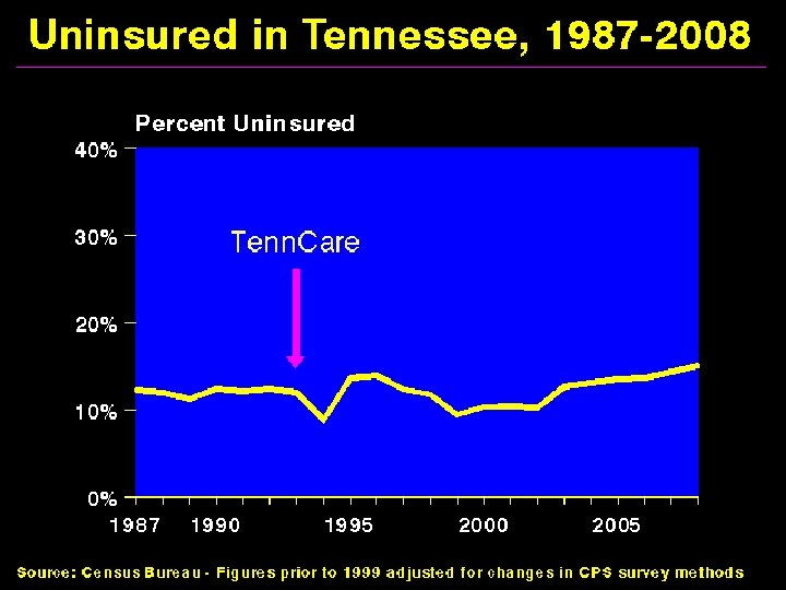 Tennessee 1992 Gov. Ned Mc. Wherter “Tennessee Gov. Ned Mc. Wherter unveiled a plan April 8 for what he called ‘the most radical health care plan in America’ and claimed it would become the national model. The Tennessee plan would gather nearly 1 million current Medicaid patients with 500, 000 uninsured Tennesseans into a single managed care program called Tenn. Care. ” “Tenn. Care is a five-year demonstration project that will use managed care organizations to deliver care to a million Medicaid recipients. Tenn. Care will cover an additional 300, 000 currently uninsured in the first year. The number of uninsured enrolled in the program could reach 500, 000 in the second year. ” Sources: Federal & State Insurance Week 4/12/93; and PR Newswire 11/19/93.