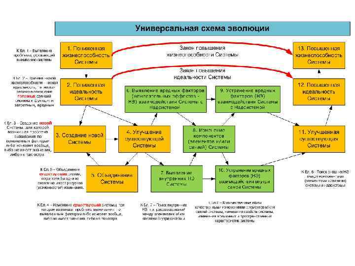 • На основе известных в Теории Решения Изобретательских Задач (ТРИЗ): 1) законов развития технических систем и 2) с помощью анализа эволюции систем самой различной природы Создана универсальная Схема эволюции