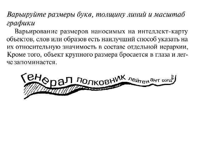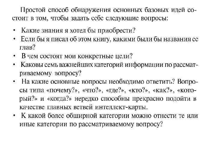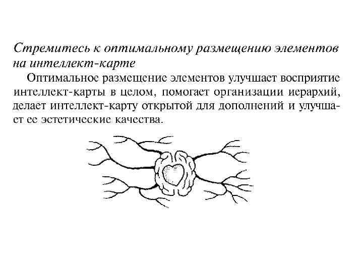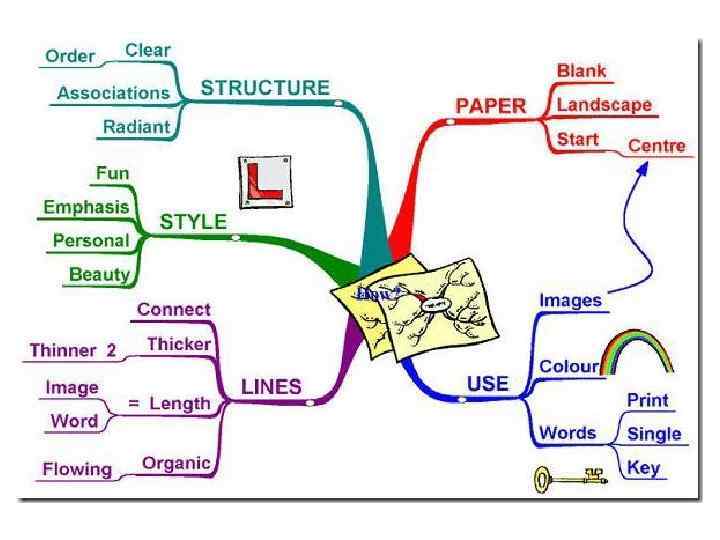 От БАЗОВОЙ ИДЕИ во все стороны расходятся ветви, ведущие к составляющим базовой идеи мыслям. В свою очередь эти составляющие также могут делиться на свои составляющие, и так до бесконечности (в теории). Естественно, на практике обычно используется только несколько ступеней иерархии, поскольку при возрастании количества ступеней становится сложно не только записывать, но и воспринимать информацию.