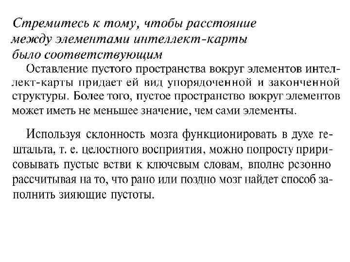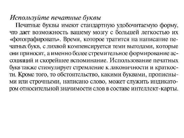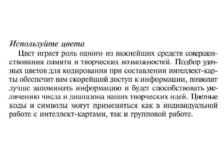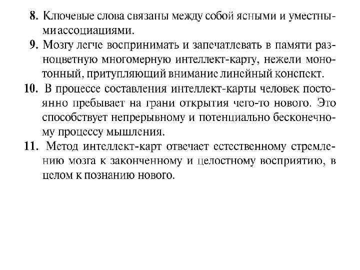 Интеллект-карты используют весь спектр способностей мозга – оперирование словами, образами и числами, логику, ритм, цвет, пространственную ориентацию, тем самым включая в работу оба полушария мозга. Комбинирование двух способностей – оперирование словами и оперирование образами многократно увеличивает отдачу, особенно когда вы создаете, а не используете готовые образы.