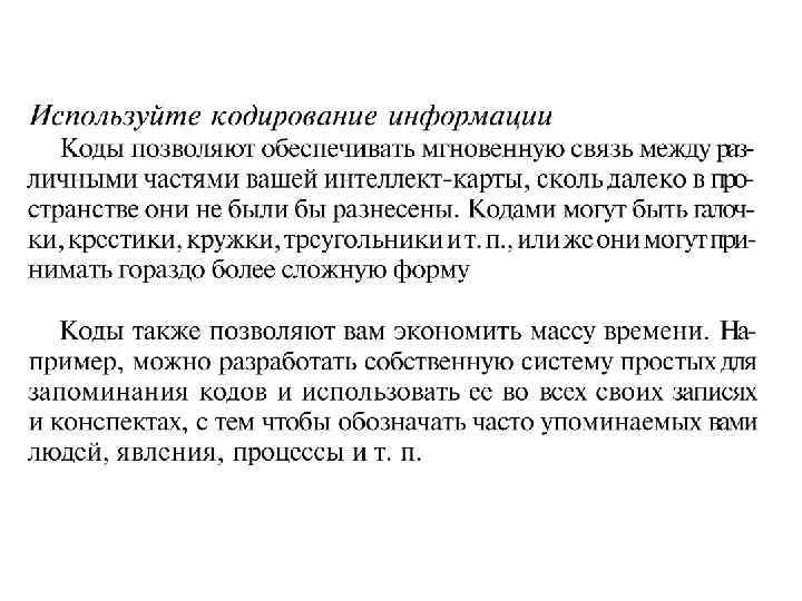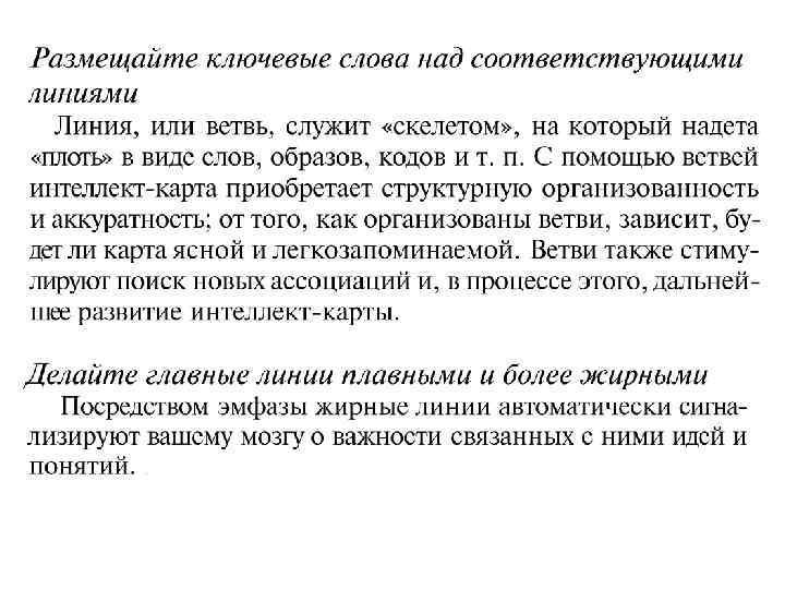 Самый распространенный вид конспекта – линейный по времени, при котором информация записывается по мере ее поступления, например, во время прослушивания лекции. Внешне более изысканный, а на поверку – столь же безалаберный! – вид конспектирования – иерархический, при котором ошметки информации располагаются не столбиком один за другим (1, 2, 3, 4 и т. д. ), а с потугой на многоуровневую структуру (1. 1, 1. 2, 1. 3, 2. 1, 2. 2. 1 и т. д). Совершенно очевидно, что ни один из традиционных общепринятых подходов к фиксированию информации не соответствует процессам, реально протекающем в нашем мозгу. Так при любом конспектировании за временным рядом теряются ключевые слова, усложняется запоминание, тратится время на фиксирование совершенно несущественных фактов, не обеспечивается стимулирования творческого потенциала нашего воображения ( «тупо переписали» ).