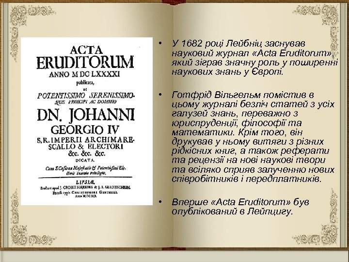 • У 1682 році Лейбніц заснував науковий журнал «Acta Eruditorum» , який зіграв значну роль у поширенні наукових знань у Європі. • Готфрід Вільгельм помістив в цьому журналі безліч статей з усіх галузей знань, переважно з юриспруденції, філософії та математики. Крім того, він друкував у ньому витяги з різних рідкісних книг, а також реферати та рецензії на нові наукові твори та всіляко сприяв залученню нових співробітників і передплатників. • Вперше «Acta Eruditorum» був опублікований в Лейпцигу.