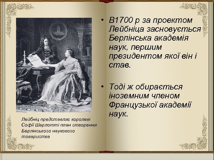 Лейбніц представляє королеві Софії Шарлотті план створення Берлінського наукового товариства • В 1700 р за проектом Лейбніца засновується Берлінська академія наук, першим президентом якої він і став. • Тоді ж обирається іноземним членом Французької академії наук.