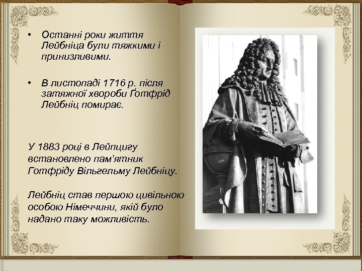 • Останні роки життя Лейбніца були тяжкими і принизливими. • В листопаді 1716 р. після затяжної хвороби Ґотфрід Лейбніц помирає. У 1883 році в Лейпцигу встановлено пам'ятник Готфріду Вільгельму Лейбніцу. Лейбніц став першою цивільною особою Німеччини, якій було надано таку можливість.