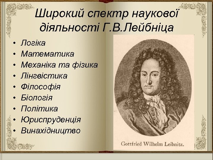 Широкий спектр наукової діяльності Г. В. Лейбніца • • • Логіка Математика Механіка та фізика Лінгвістика Філософія Біологія Політика Юриспруденція Винахідництво