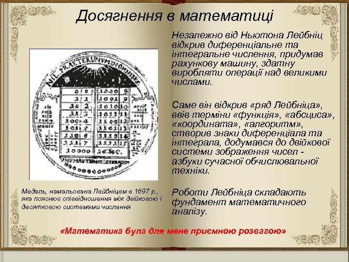 Досягнення в математиці Незалежно від Ньютона Лейбніц відкрив диференціальне та інтегральне числення, придумав рахункову машину, здатну виробляти операції над великими числами. Саме він відкрив «ряд Лейбніца» , ввів терміни «функція» , «абсциса» , «координата» , «алгоритм» , створив знаки диференціала та інтеграла, додумався до двійкової системи зображення чисел - азбуки сучасної обчислювальної техніки. Медаль, намальована Лейбніцем в 1697 р. , яка пояснює співвідношення між двійковою і десятковою системами числення Роботи Лейбніца складають фундамент математичного аналізу. «Математика була для мене приємною розвагою»