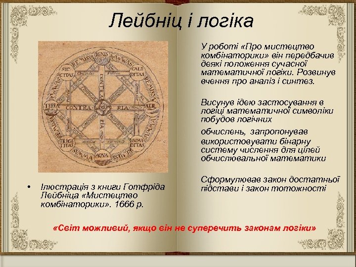 Лейбніц і логіка У роботі «Про мистецтво комбінаторики» він передбачив деякі положення сучасної математичної логіки. Розвинув вчення про аналіз і синтез. Висунув ідею застосування в логіці математичної символіки побудов логічних обчислень, запропонував використовувати бінарну систему числення для цілей обчислювальної математики • Ілюстрація з книги Готфріда Лейбніца «Мистецтво комбінаторики» . 1666 р. Сформулював закон достатньої підстави і закон тотожності «Світ можливий, якщо він не суперечить законам логіки»