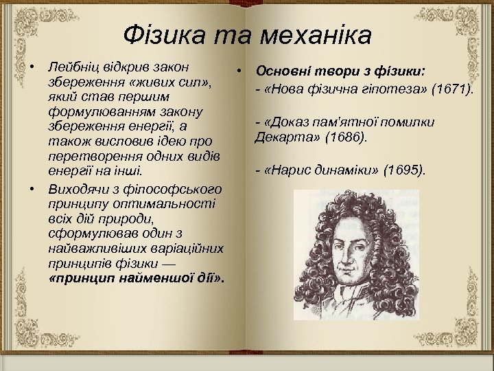 Фізика та механіка • Лейбніц відкрив закон • Основні твори з фізики: збереження «живих сил» , - «Нова фізична гіпотеза» (1671). який став першим формулюванням закону - «Доказ пам'ятної помилки збереження енергії, а Декарта» (1686). також висловив ідею про перетворення одних видів - «Нарис динаміки» (1695). енергії на інші. • Виходячи з філософського принципу оптимальності всіх дій природи, сформулював один з найважливіших варіаційних принципів фізики — «принцип найменшої дії» .