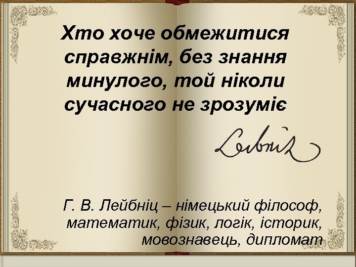 Хто хоче обмежитися справжнім, без знання минулого, той ніколи сучасного не зрозуміє Г. В. Лейбніц – німецький філософ, математик, фізик, логік, історик, мовознавець, дипломат