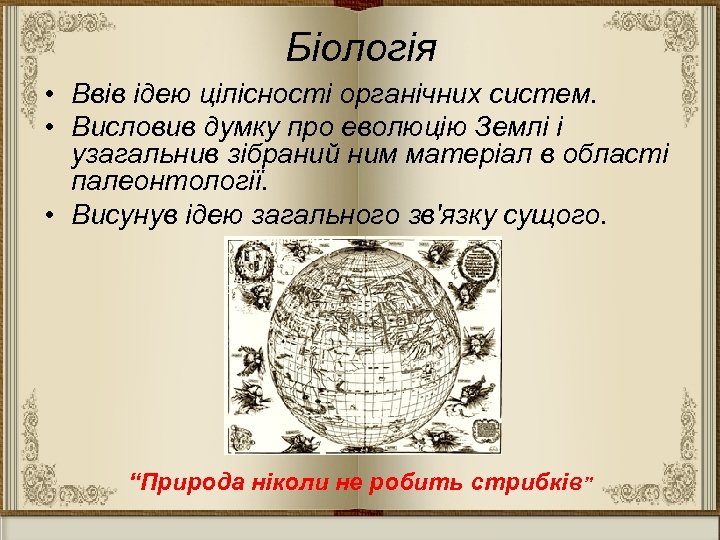 Біологія • Ввів ідею цілісності органічних систем. • Висловив думку про еволюцію Землі і узагальнив зібраний ним матеріал в області палеонтології. • Висунув ідею загального зв'язку сущого. “Природа ніколи не робить стрибків”