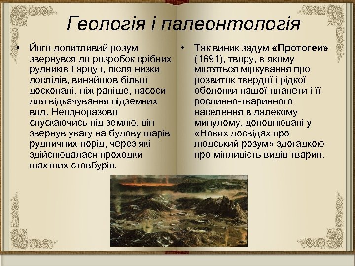 Геологія і палеонтологія • Його допитливий розум • Так виник задум «Протогеи» звернувся до розробок срібних (1691), твору, в якому рудників Гарцу і, після низки містяться міркування про дослідів, винайшов більш розвиток твердої і рідкої досконалі, ніж раніше, насоси оболонки нашої планети і її для відкачування підземних рослинно-тваринного вод. Неодноразово населення в далекому спускаючись під землю, він минулому, доповнювані у звернув увагу на будову шарів «Нових досвідах про рудничних порід, через які людський розум» здогадкою здійснювалася проходки про мінливість видів тварин. шахтних стовбурів.