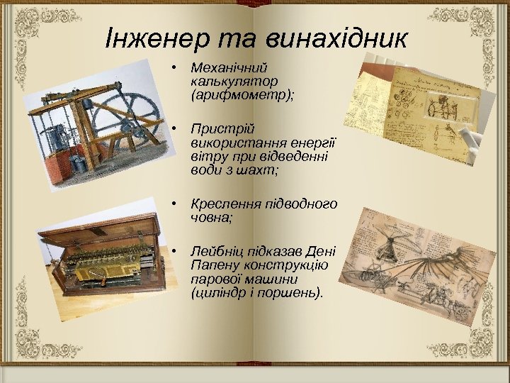 Інженер та винахідник • Механічний калькулятор (арифмометр); • Пристрій використання енергії вітру при відведенні води з шахт; • Креслення підводного човна; • Лейбніц підказав Дені Папену конструкцію парової машини (циліндр і поршень).