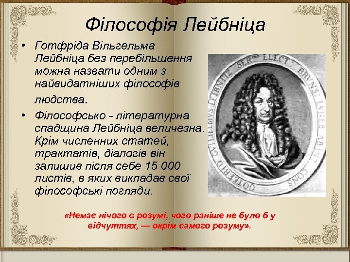 Філософія Лейбніца • Готфріда Вільгельма Лейбніца без перебільшення можна назвати одним з найвидатніших філософів людства. • Філософсько - літературна спадщина Лейбніца величезна. Крім численних статей, трактатів, діалогів він залишив після себе 15 000 листів, в яких викладав свої філософські погляди. «Немає нічого в розумі, чого раніше не було б у відчуттях, — окрім самого розуму» .