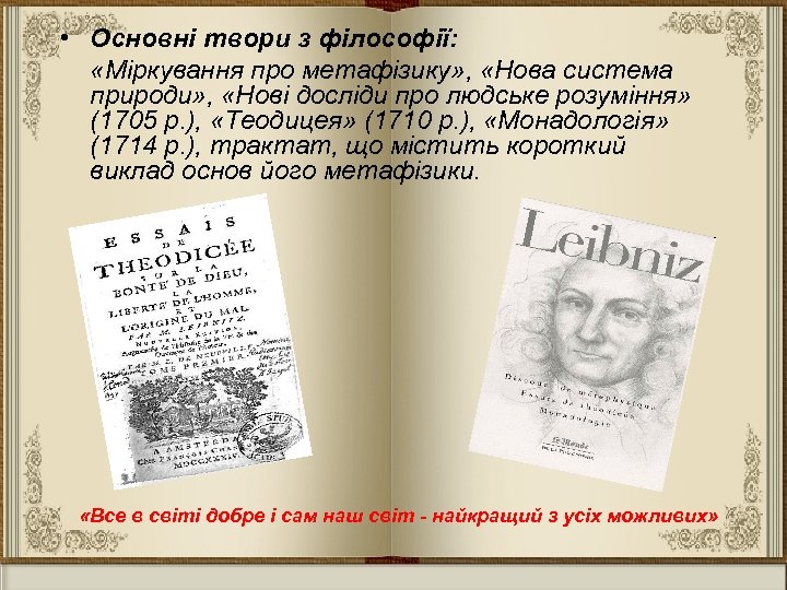 • Основні твори з філософії: «Міркування про метафізику» , «Нова система природи» , «Нові досліди про людське розуміння» (1705 р. ), «Теодицея» (1710 р. ), «Монадологія» (1714 р. ), трактат, що містить короткий виклад основ його метафізики. «Все в світі добре і сам наш світ - найкращий з усіх можливих»
