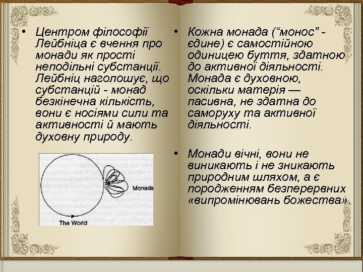 • Центром філософії • Лейбніца є вчення про монади як прості неподільні субстанції. Лейбніц наголошує, що субстанцій - монад безкінечна кількість, вони є носіями сили та активності й мають духовну природу. • Кожна монада (“монос” - єдине) є самостійною одиницею буття, здатною до активної діяльності. Монада є духовною, оскільки матерія — пасивна, не здатна до саморуху та активної діяльності. Монади вічні, вони не виникають і не зникають природним шляхом, а є породженням безперервних «випромінювань божества» .