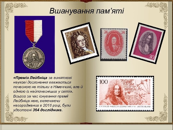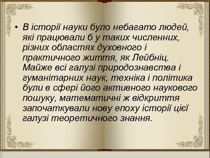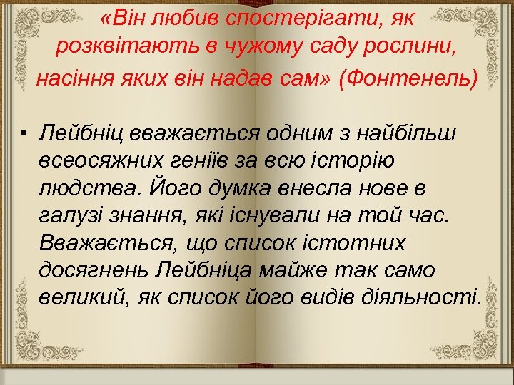 «Він любив спостерігати, як розквітають в чужому саду рослини, насіння яких він надав сам» (Фонтенель) • Лейбніц вважається одним з найбільш всеосяжних геніїв за всю історію людства. Його думка внесла нове в галузі знання, які існували на той час. Вважається, що список істотних досягнень Лейбніца майже так само великий, як список його видів діяльності.