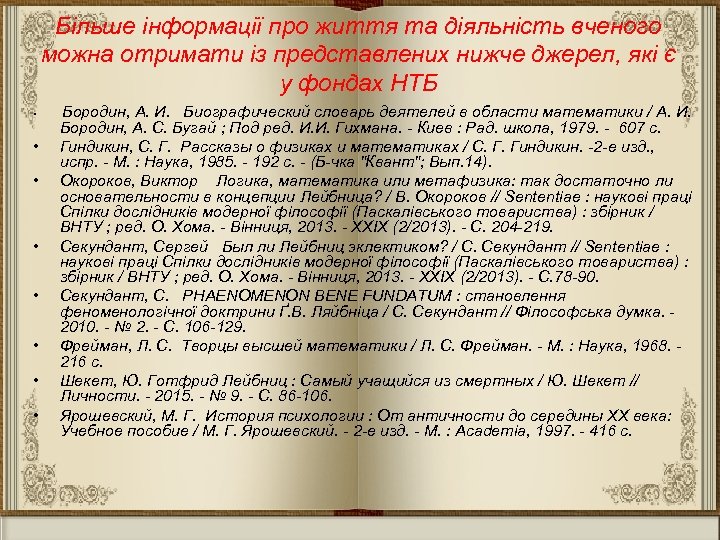 Більше інформації про життя та діяльність вченого можна отримати із представлених нижче джерел, які є у фондах НТБ • • Бородин, А. И. Биографический словарь деятелей в области математики / А. И. Бородин, А. С. Бугай ; Под ред. И. И. Гихмана. - Киев : Рад. школа, 1979. - 607 с. Гиндикин, С. Г. Рассказы о физиках и математиках / С. Г. Гиндикин. -2 -е изд. , испр. - М. : Наука, 1985. - 192 с. - (Б-чка "Квант"; Вып. 14). Окороков, Виктор Логика, математика или метафизика: так достаточно ли основательности в концепции Лейбница? / В. Окороков // Sententiae : наукові праці Спілки дослідників модерної філософії (Паскалівського товариства) : збірник / ВНТУ ; ред. О. Хома. - Вінниця, 2013. - XXIX (2/2013). - С. 204 -219. Секундант, Сергей Был ли Лейбниц эклектиком? / С. Секундант // Sententiae : наукові праці Спілки дослідників модерної філософії (Паскалівського товариства) : збірник / ВНТУ ; ред. О. Хома. - Вінниця, 2013. - XXIX (2/2013). - С. 78 -90. Секундант, С. PHAENOMENON BENE FUNDATUM : становлення феноменологічної доктрини Ґ. В. Ляйбніца / С. Секундант // Філософська думка. - 2010. - № 2. - С. 106 -129. Фрейман, Л. С. Творцы высшей математики / Л. С. Фрейман. - М. : Наука, 1968. - 216 с. Шекет, Ю. Готфрид Лейбниц : Самый учащийся из смертных / Ю. Шекет // Личности. - 2015. - № 9. - С. 86 -106. Ярошевский, М. Г. История психологии : От античности до середины ХХ века: Учебное пособие / М. Г. Ярошевский. - 2 -е изд. - М. : Academia, 1997. - 416 с.