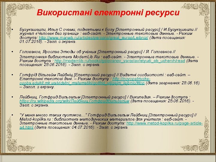 Використані електронні ресурси • Бузукашвили, Илья С очами, поднятыми к Богу [Электронный ресурс] / И. Бузукашвили // журнал «Человек без границ» : веб-сайт. - Электронные текстовые данные. - Режим доступа: http: //www. manwb. ru/articles/persons/great_europ/Leibniz/ (дата посещения: 01. 07. 2016). - Загл. с экрана. • Голованов, Ярослав Этюды об учёных [Электронный ресурс] / Я. Голованов // Электронная библиотека Modern. Lib. Ru : веб-сайт. - Электронные текстовые данные. - Режим доступа : http: //modernlib. ru/books/golovanov_yaroslav/etyudi_ob_uchenih/read (дата посещения: 28. 06. 2016). - Загл. с экрана. • Готфрід Вільгейм Лейбніц [Електроний ресурс] // Видатні особистості : веб-сайт. – Електронні текстові дані. – Режим доступу : http: //novopetrivskeosoba. edukit. mk. ua/vidatni_matematiki/gotfrid_viljgejm_lejbnic/#top (дата звернення: 28. 06. 16). – Загол. з екрану. • Лейбниц, Готфрид Вильгельм [Электронный ресурс] / Википедия. – Режим доступа : https: //ru. wikipedia. org/wiki/Лейбниц, Готфрид. Вильгельм (дата посещения: 25. 06. 2016). - Загл. с экрана. • “У меня много таких пустяков…” Готфрид Вильгельм Лейбниц [Электронный ресурс] // Metod-kopilka. ru : библиотека методических материалов для учителя : веб-сайт. - Электронные текстовые данные. - Режим доступа: http: //www. metod-kopilka. ru/page-articlea 4. html (дата посещения: 04. 07. 2016). - Загл. с экрана.