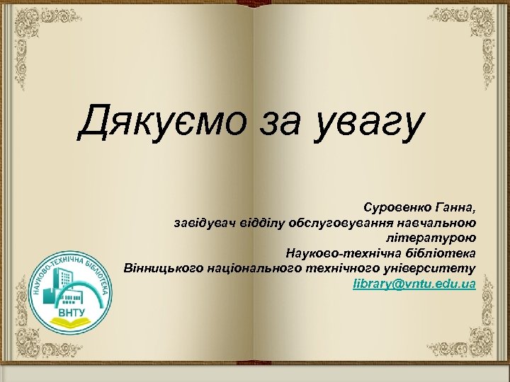 Дякуємо за увагу Суровенко Ганна, завідувач відділу обслуговування навчальною літературою Науково-технічна бібліотека Вінницького національного технічного університету library@vntu. edu. ua