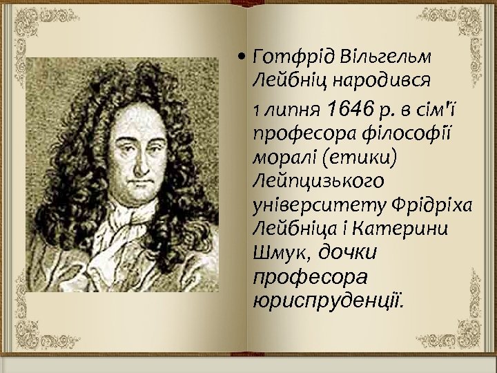 • Готфрід Вільгельм Лейбніц народився 1 липня 1646 р. в сім'ї професора філософії моралі (етики) Лейпцизького університету Фрідріха Лейбніца і Катерини Шмук, дочки професора юриспруденції.