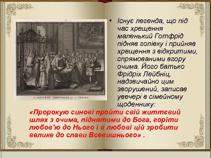 • Існує легенда, що під час хрещення маленький Готфрід підняв голівку і прийняв хрещення з відкритими, спрямованими вгору очима. Його батько Фрідріх Лейбніц, надзвичайно цим зворушений, записав увечері в сімейному щоденнику: «Пророкую синові пройти свій життєвий шлях з очима, піднятими до Бога, горіти любов'ю до Нього і в любові цій зробити велике до слави Всевишнього» .