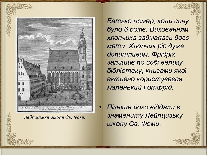 Батько помер, коли сину було 6 років. Вихованням хлопчика займалась його мати. Хлопчик ріс дуже допитливим. Фрідріх залишив по собі велику бібліотеку, книгами якої активно користувався маленький Готфрід. Лейпцизька школа Св. Фоми • Пізніше його віддали в знамениту Лейпцизьку школу Св. Фоми.