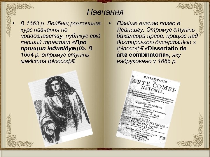 Навчання • В 1663 р. Лейбніц розпочинає • Пізніше вивчав право в курс навчання по Лейпцигу. Отримує ступінь правознавству, публікує свій бакалавра права, працює над перший трактат «Про докторською дисертацією з принцип індивідуації» . В філософії «Dissertatio de 1664 р. отримує ступінь arte combinatoria» , яку магістра філософії. надруковано у 1666 р.